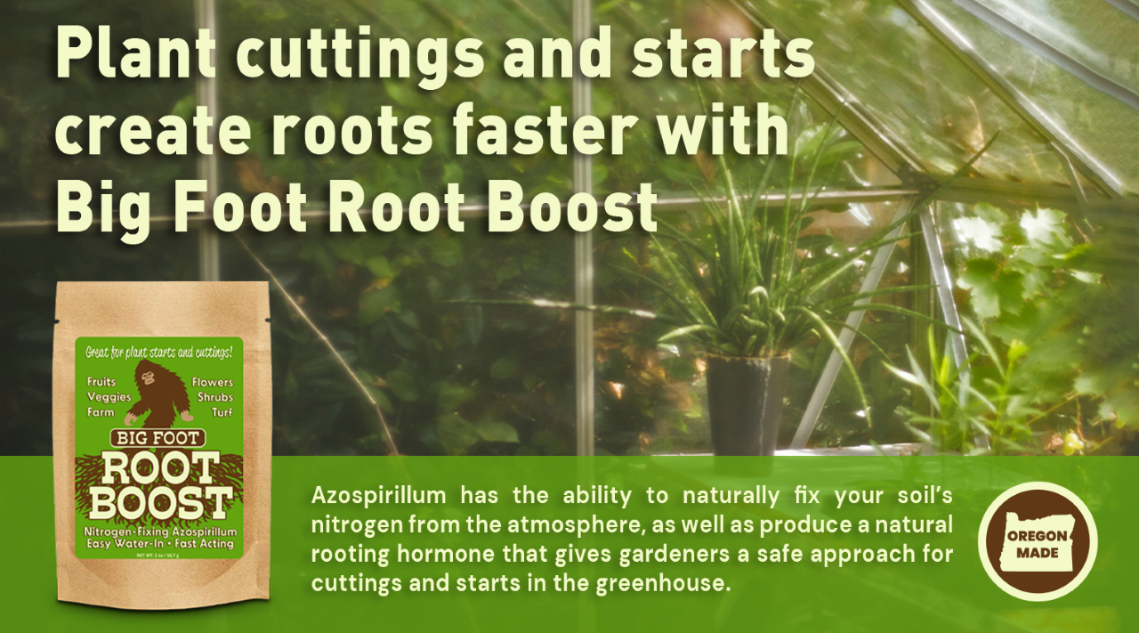 Big Foot Root Boost contains Azospirillum brasilense, an all natural, powerful nitrogen-fixing beneficial bacteria that lets your plants thrive in the soil it’s already in – and can help new plants and cutting establish roots faster.