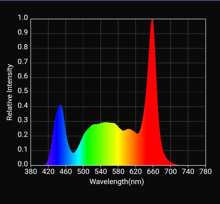 - Plant-centric White spectrum with Deep Red. Red:Green:Blue ratio of 48:32:20